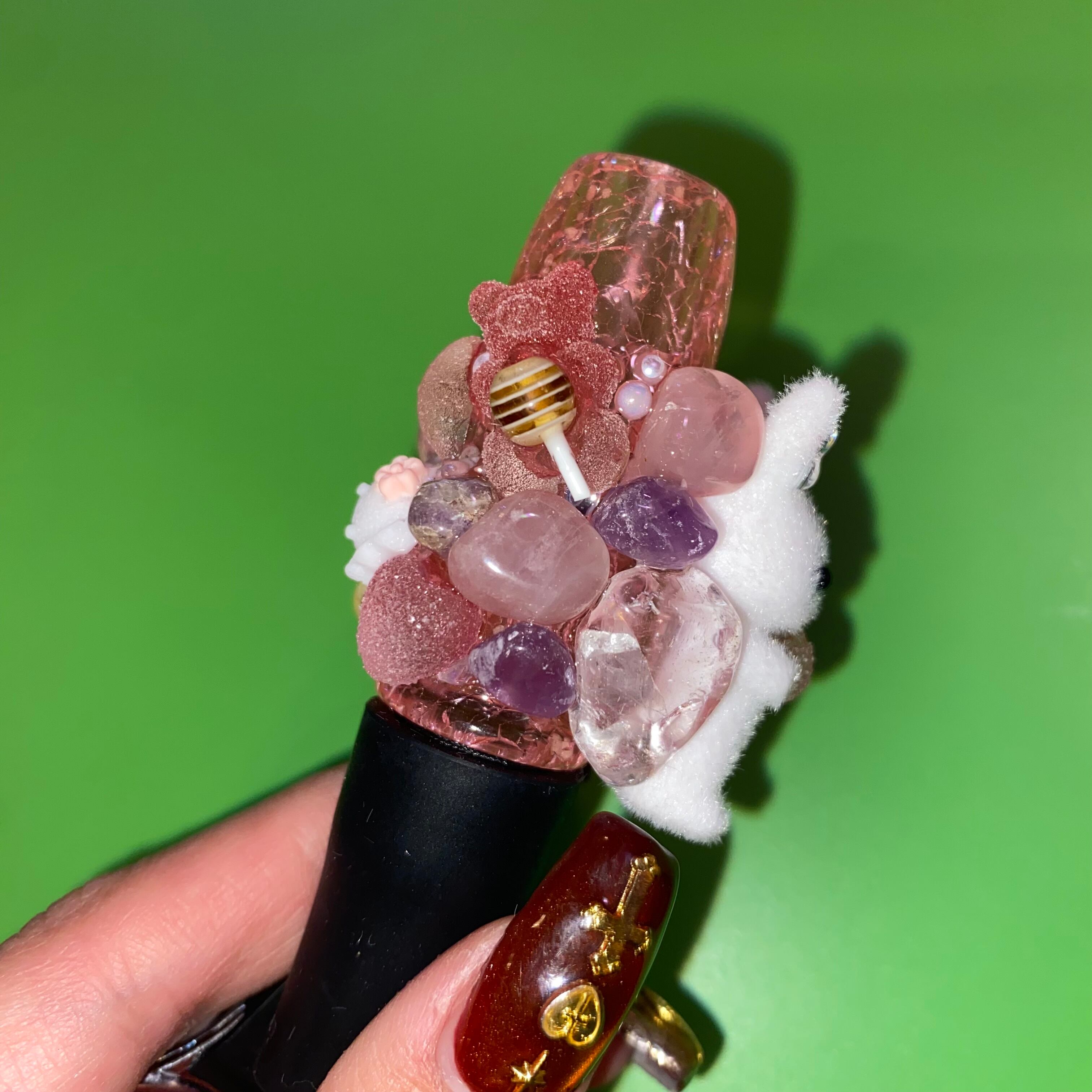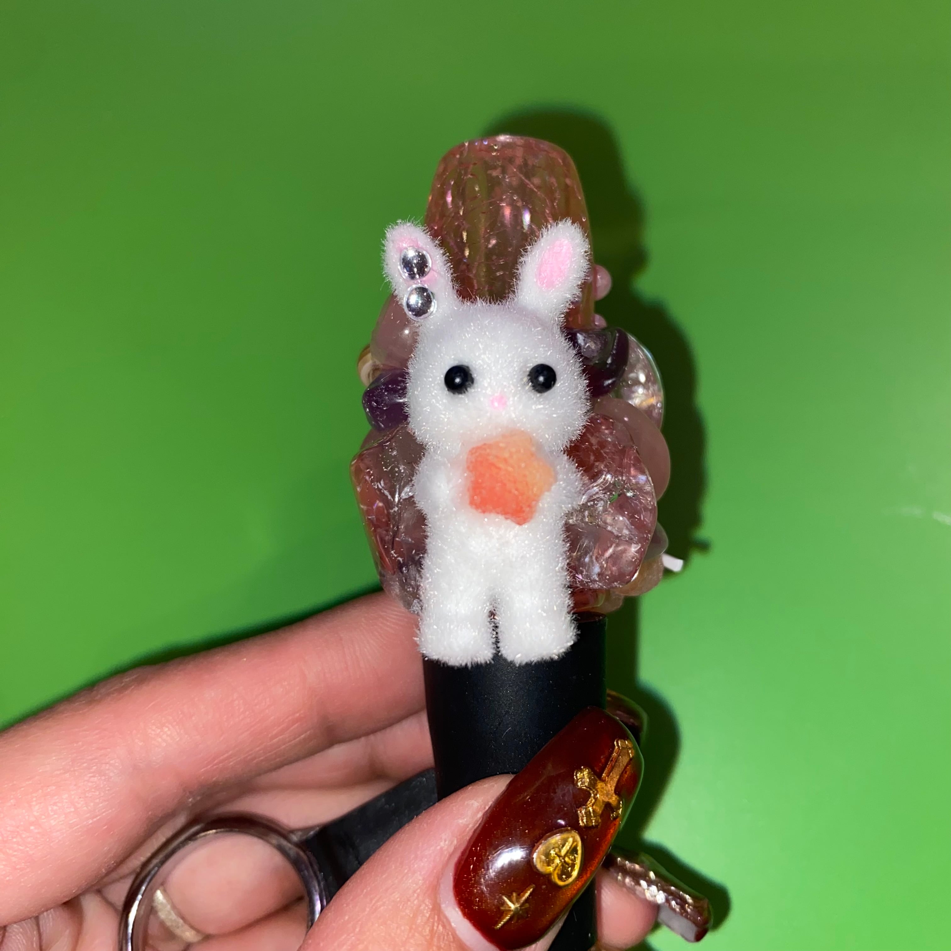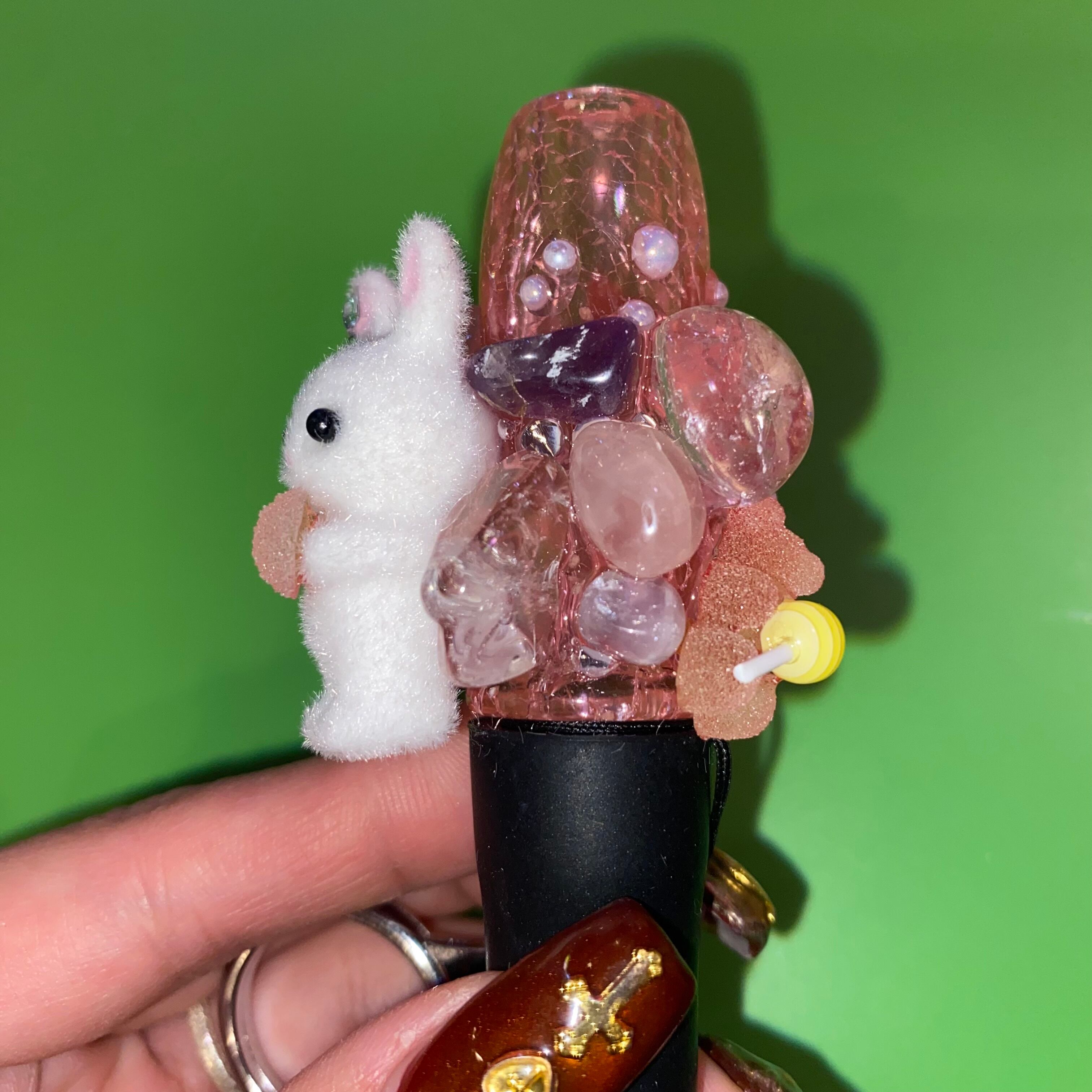 うさぎちゃんちゃん、アメジスト、ローズクォーツ、水晶のパワーストーンが付いてます。